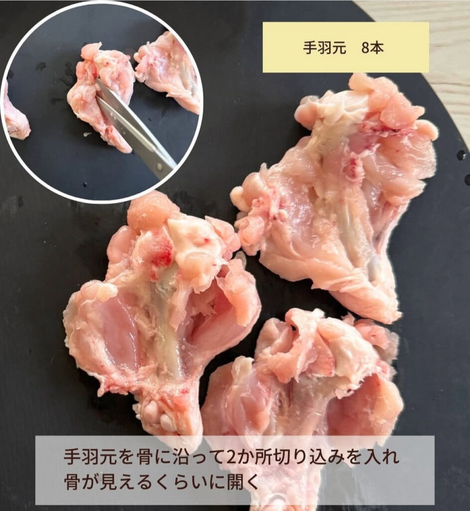 手羽元を骨に沿って2か所切り込みを入れ、骨が見えるくらいに開く。