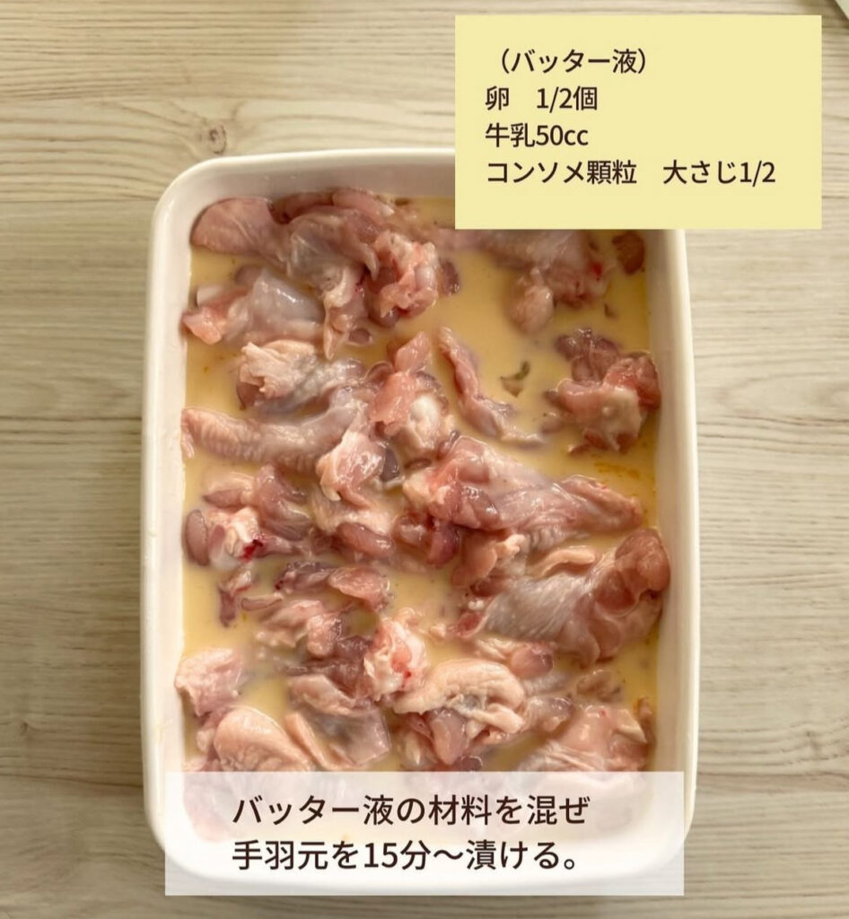 バッター液の材料を混ぜ、手羽元を30分以上漬ける。