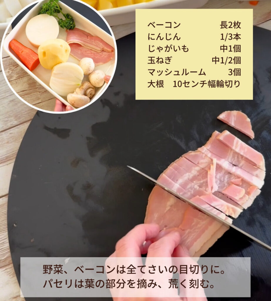 ベーコンは約5㎜幅 野菜類(玉ねぎ、じゃがいも、にんじん、大根)は1㎝程度の角切りに、マッシュルームは縦半分にして薄切りにする。