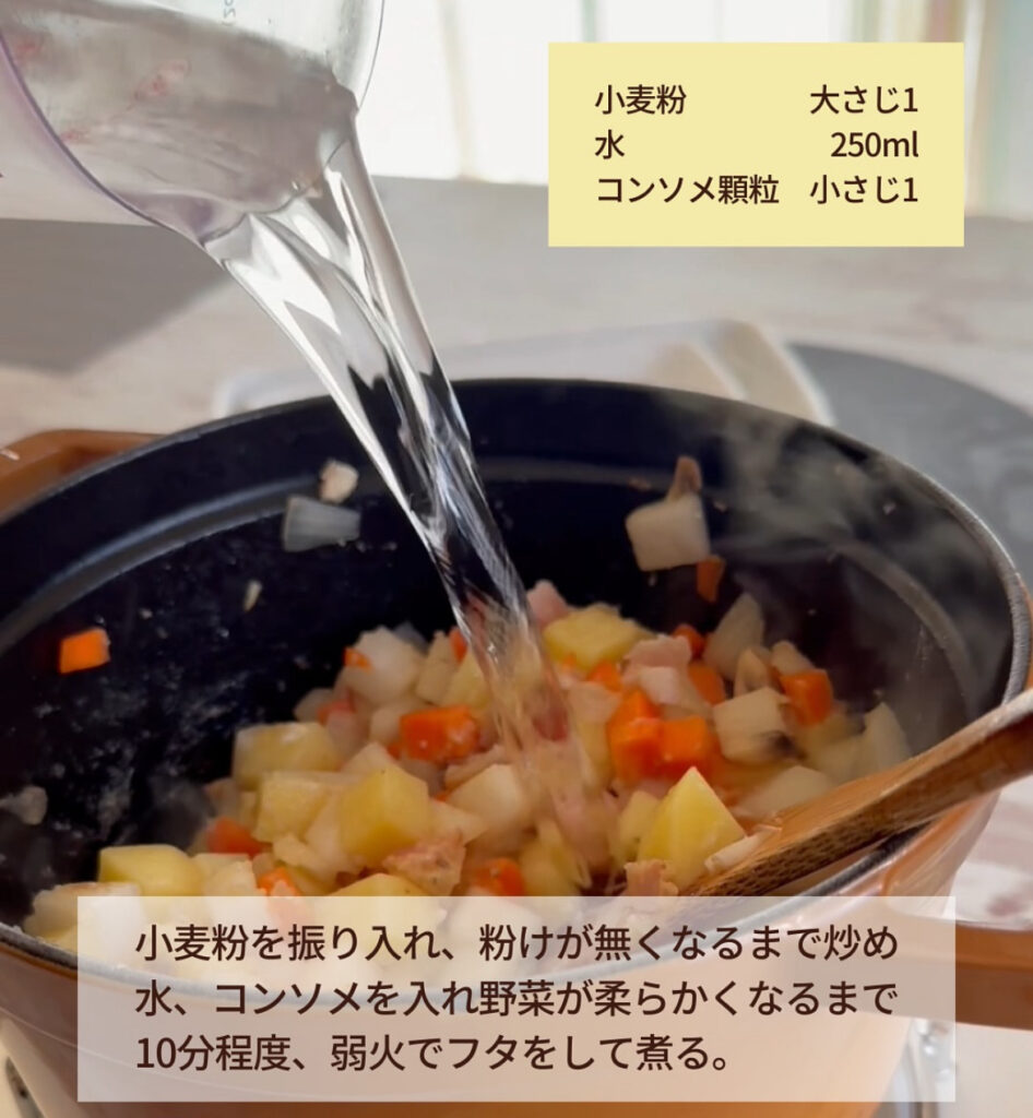 STEP2に小麦粉を振り入れ、粉けが無くなるまで炒め、水・コンソメ顆粒・塩を入れ野菜が柔らかくなるまで10分程度フタをして弱火で煮る。