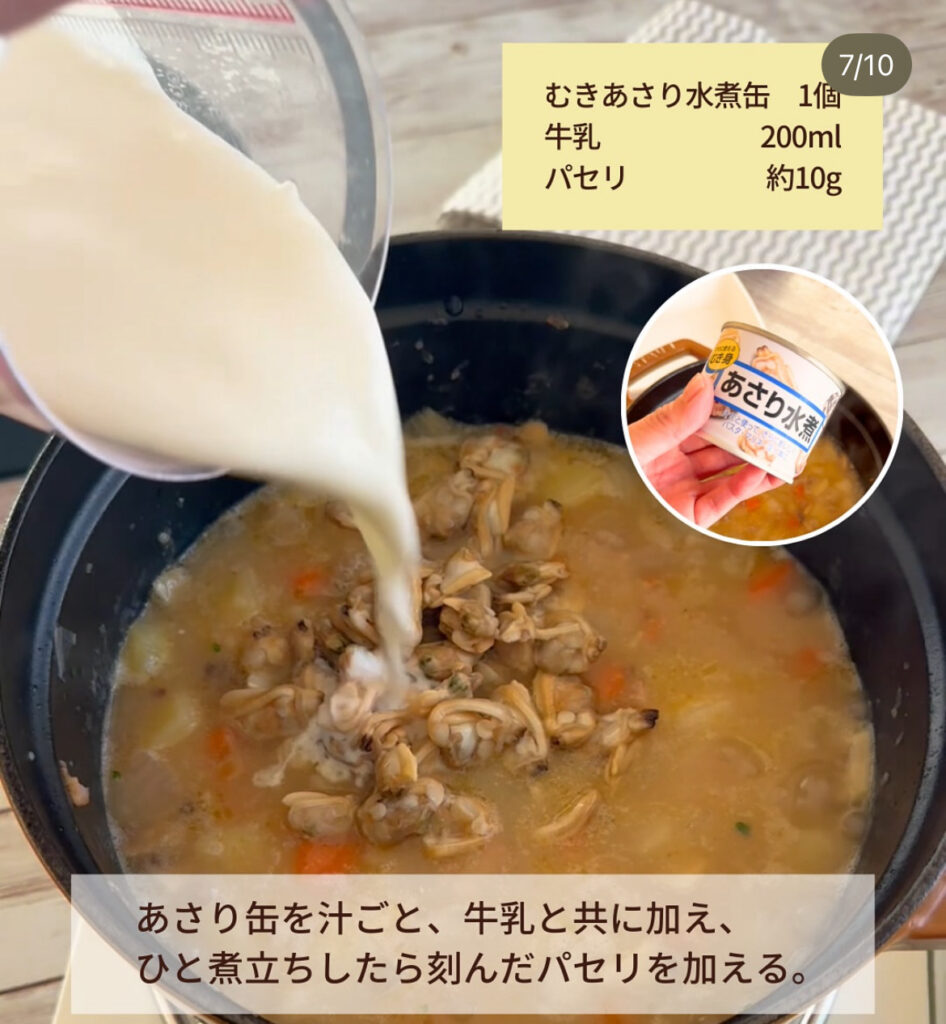 野菜が柔らかくなったら、あさり水煮缶を汁ごと・牛乳を加え、塩コショウで味を調えてひと煮立ちさせる。