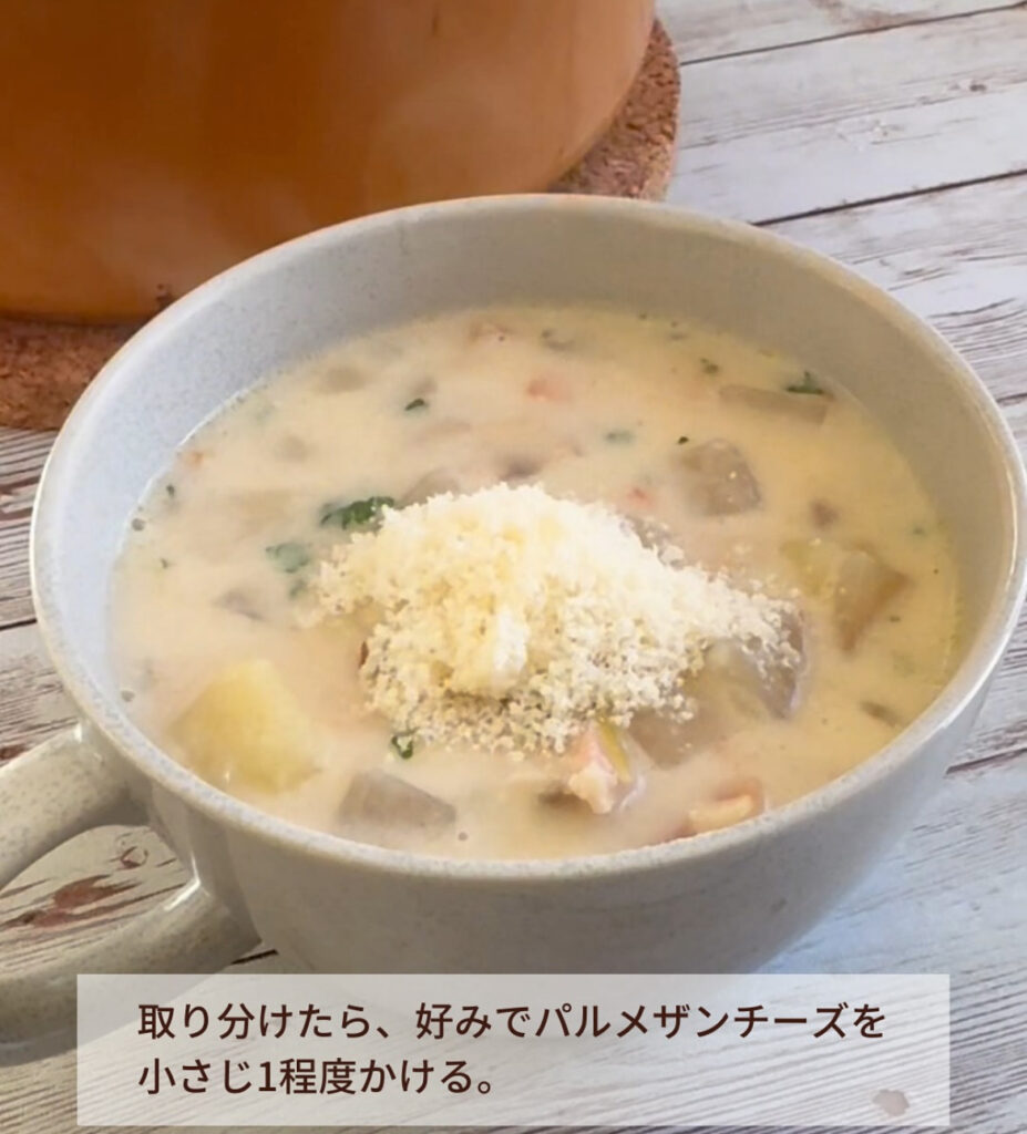 器に盛り分けたら好みでパルメザンチーズを小さじ1程度上に添える。