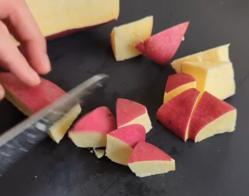 - 太めのサツマイモを使うときは、真ん中から半分に切ってから乱切りにすると炊きムラを防げる。